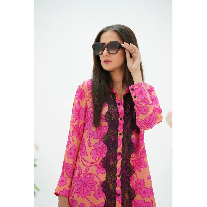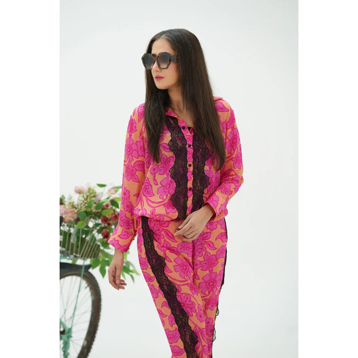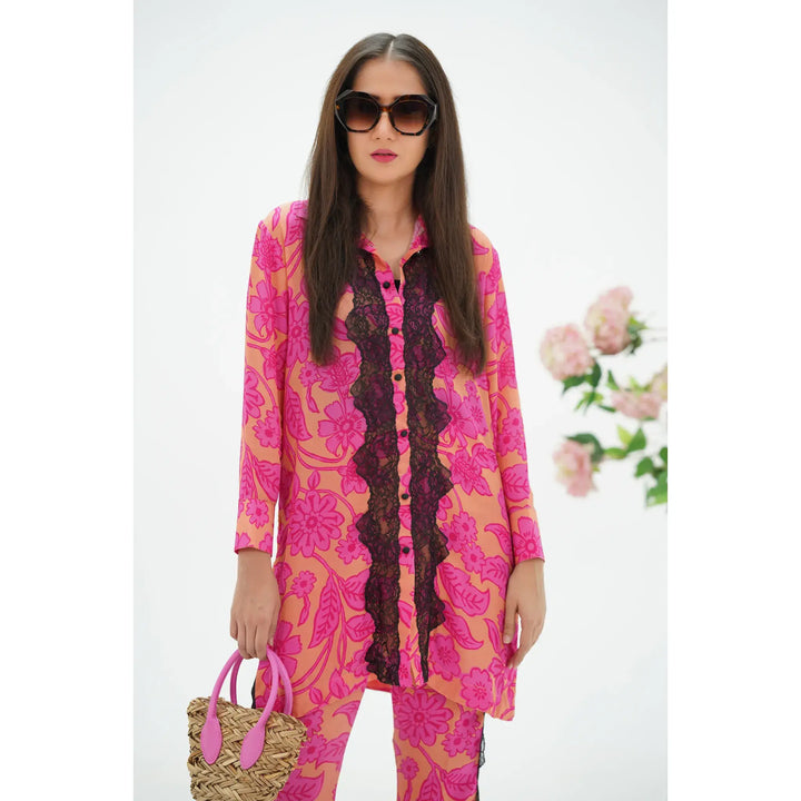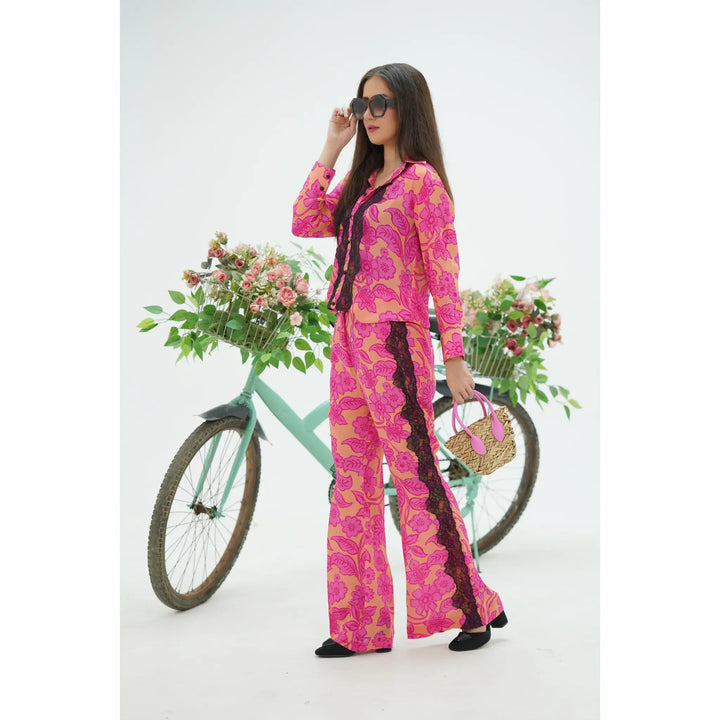 This barbie co-ords set features a bold floral print in shades of pink creating a lively and eye-catching look. The top is a long cuff sleeve tunic with a straight cut, adorned with a contrasting black lace trim along the shirt and bell cut trouser.
