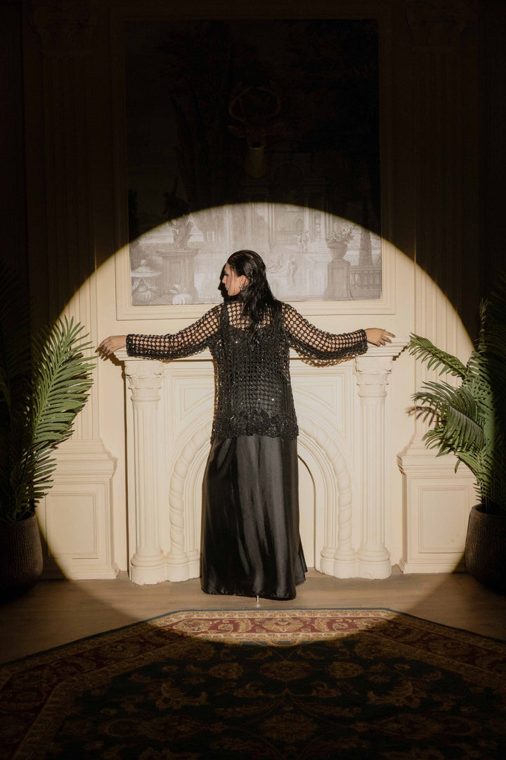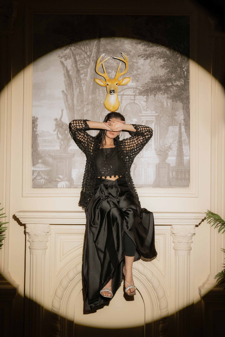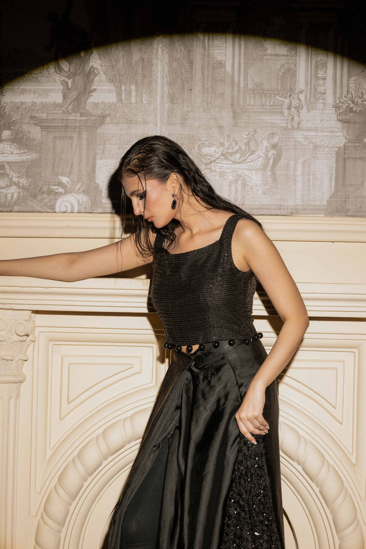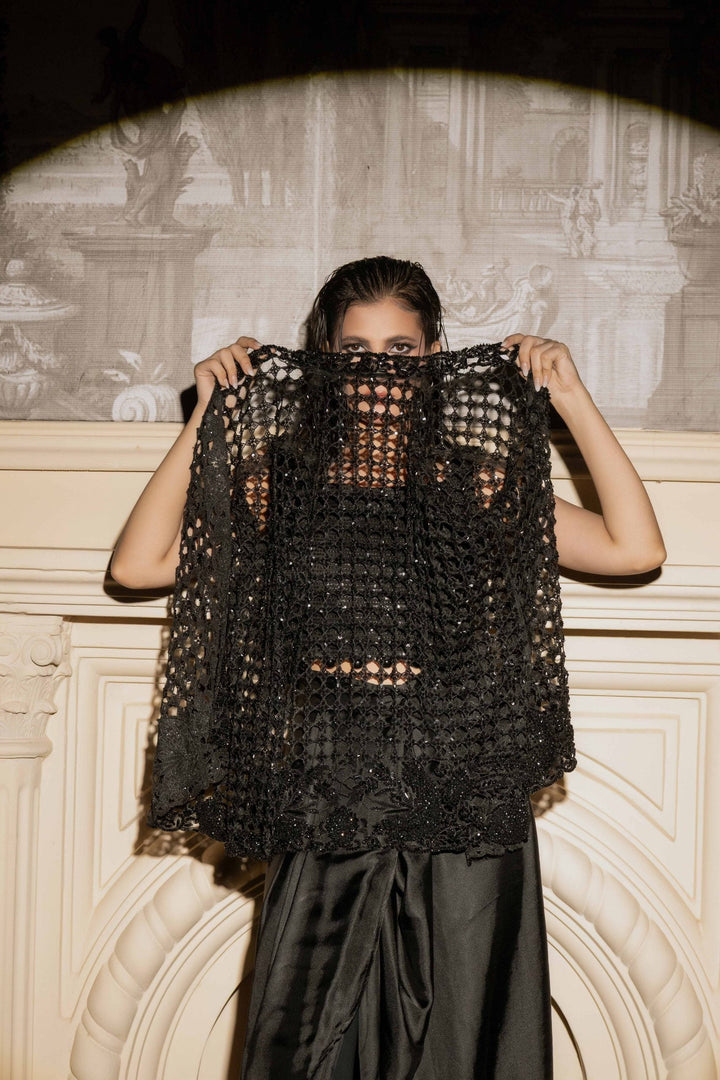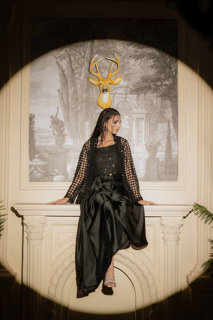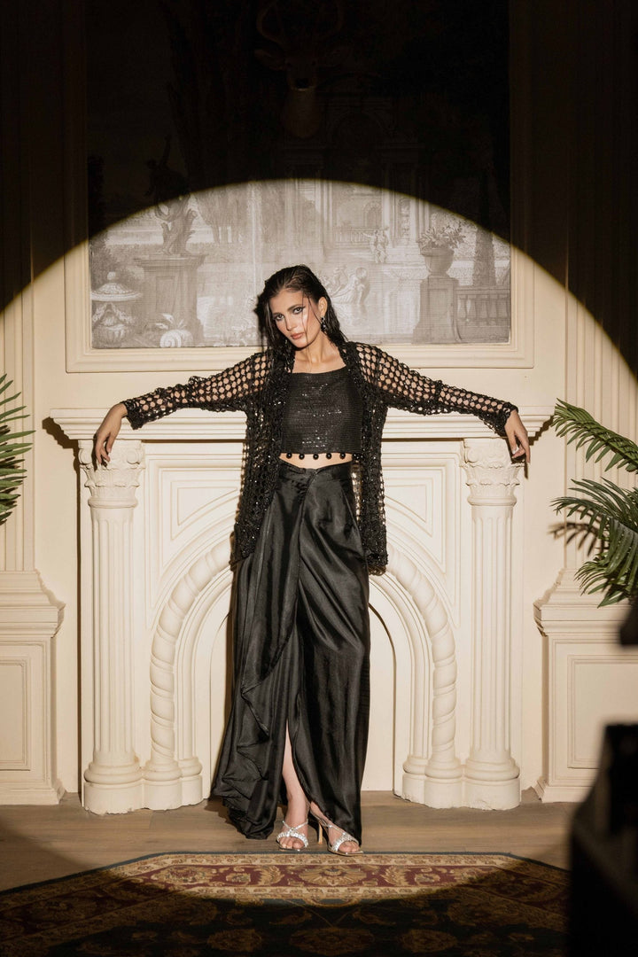Black Aura is a bold and captivating ensemble that defines modern elegance. The gown, crafted from sheer organza with intricate detailing, is paired with sleek trousers in shimmer fabric and a delicate net layer for added texture. The all-black look, highlighted with subtle sparkle and a statement silhouette, makes it perfect for evening soirées, parties, and high-fashion occasions.