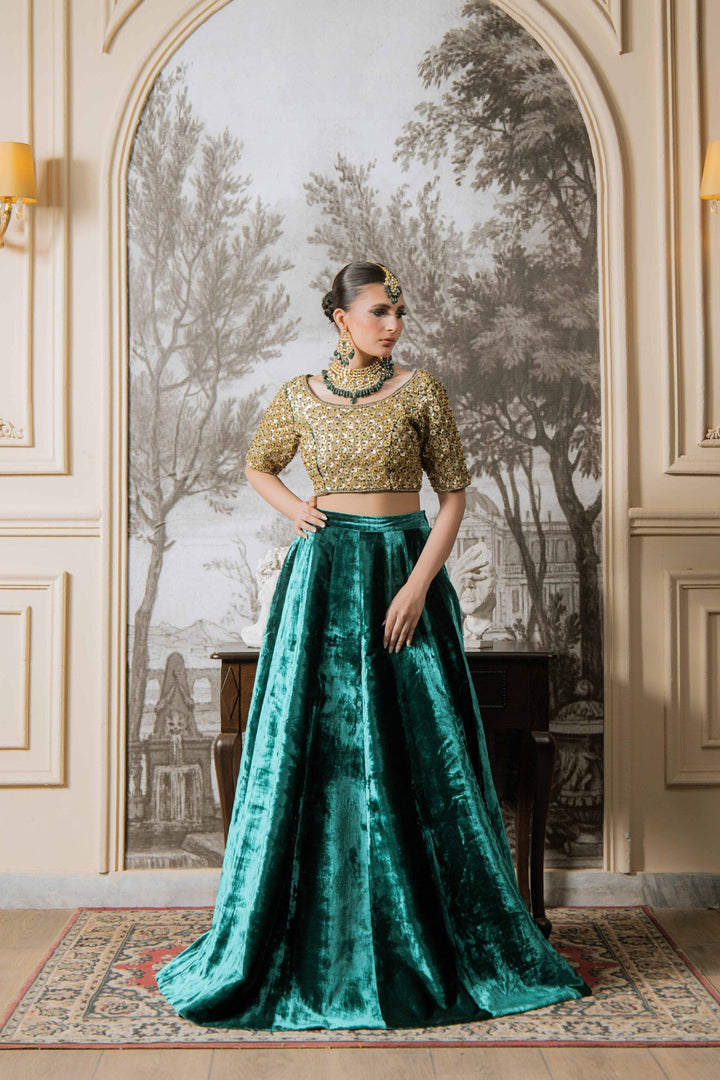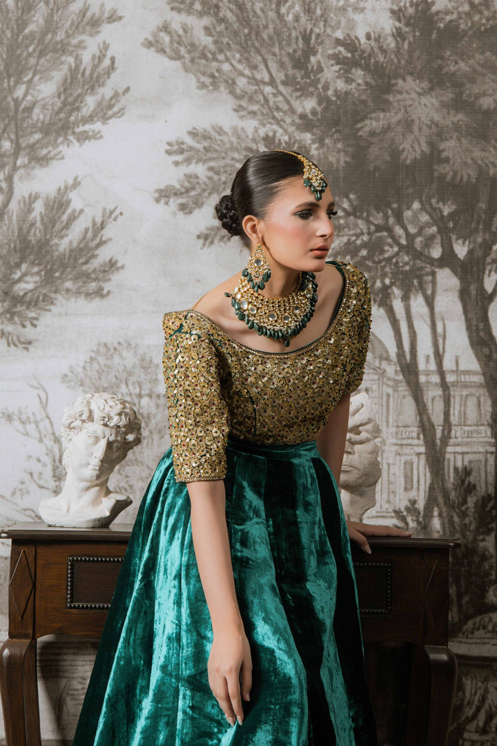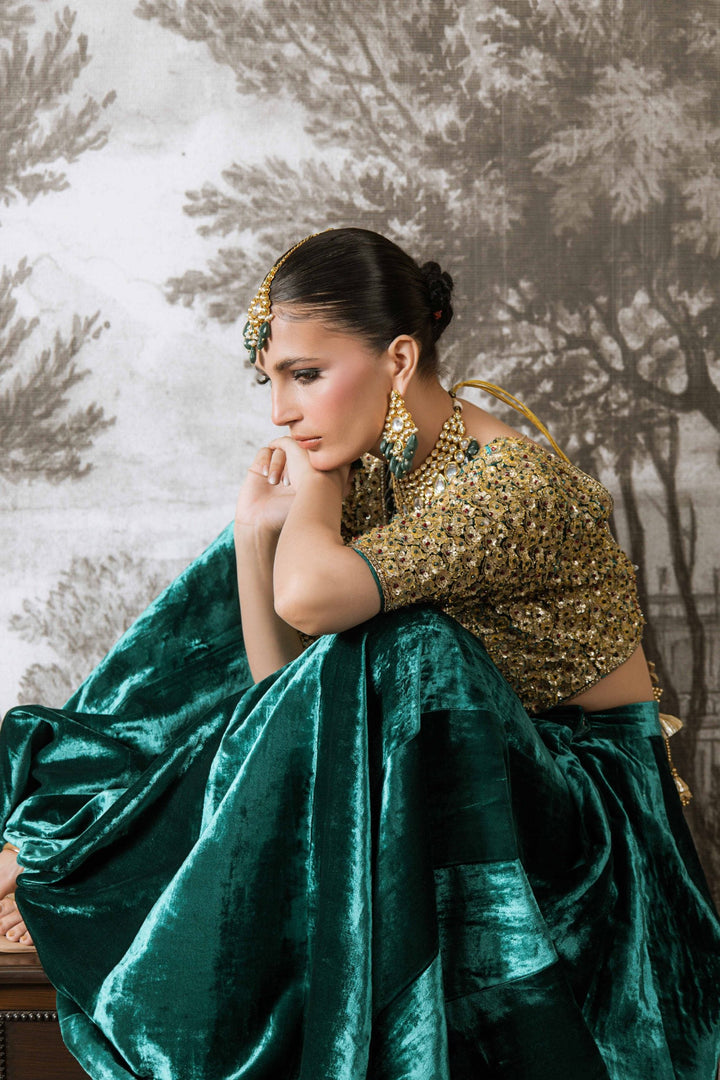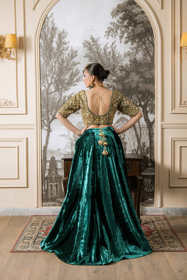 Blue Peacock is a regal lehenga choli ensemble designed to exude grandeur. The choli dazzles with golden embellishments, while the voluminous lehenga in deep peacock blue velvet flows gracefully, creating a royal and luxurious look. Perfect for weddings, receptions, and festive celebrations, this outfit embodies bold elegance and timeless sophistication.