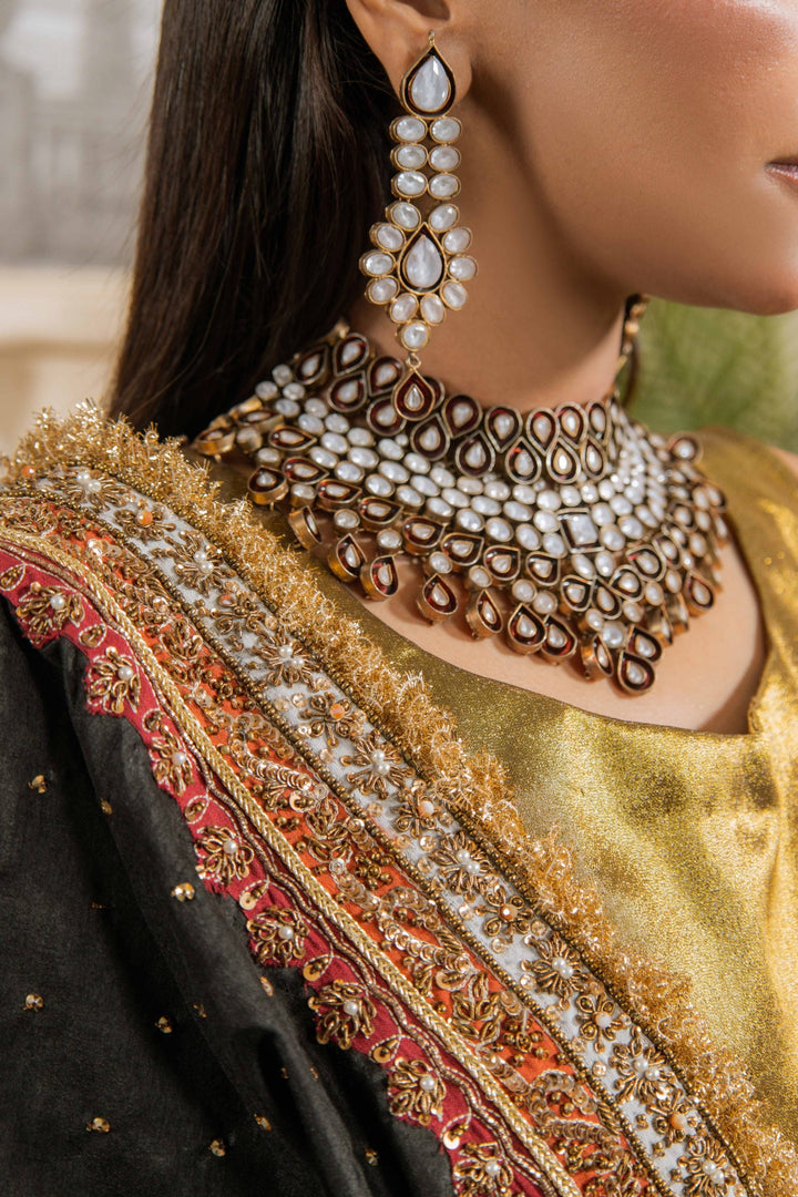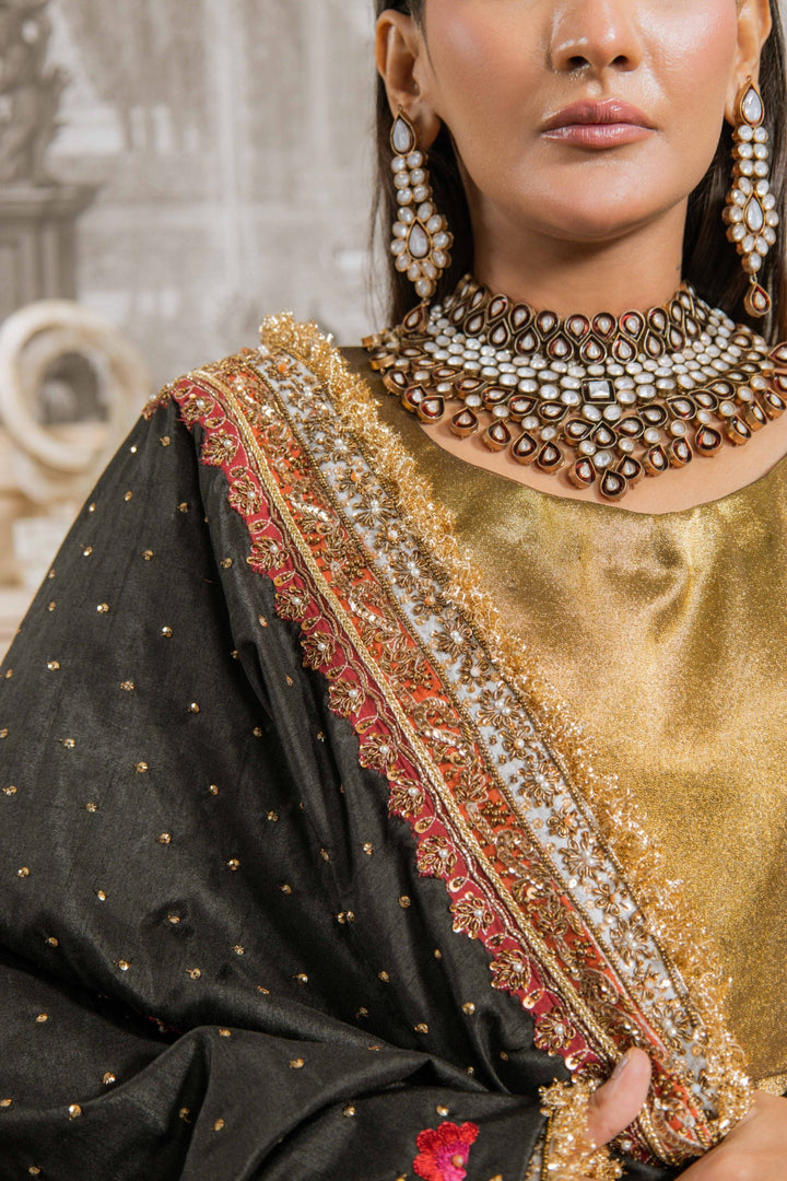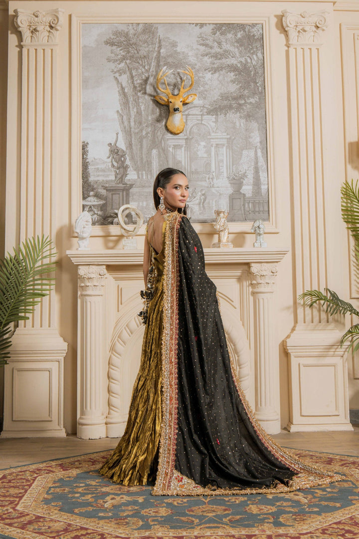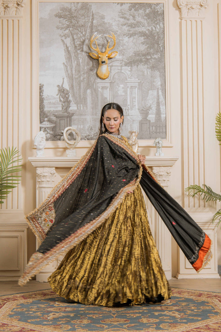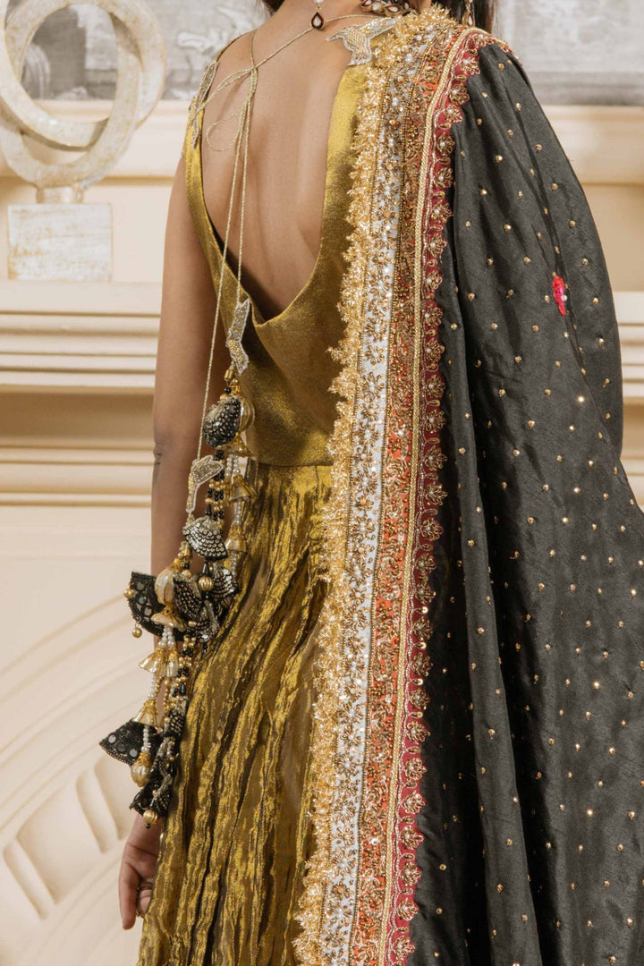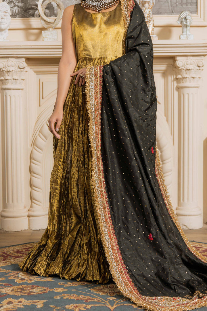 Mastani is a striking and regal ensemble designed to make a statement. The sleeveless golden frock-style silhouette is crafted with rich textures, flowing gracefully with every step. Paired with a black dupatta highlighted with intricate zari work and detailed borders, this outfit radiates timeless elegance and grandeur—perfect for weddings and festive occasions.