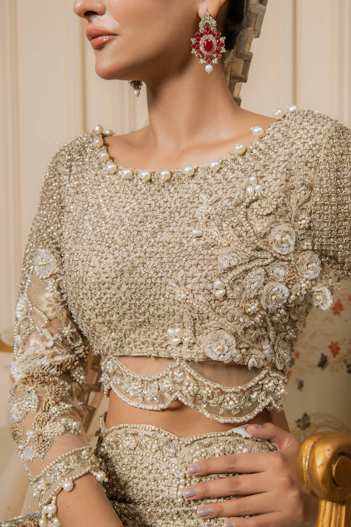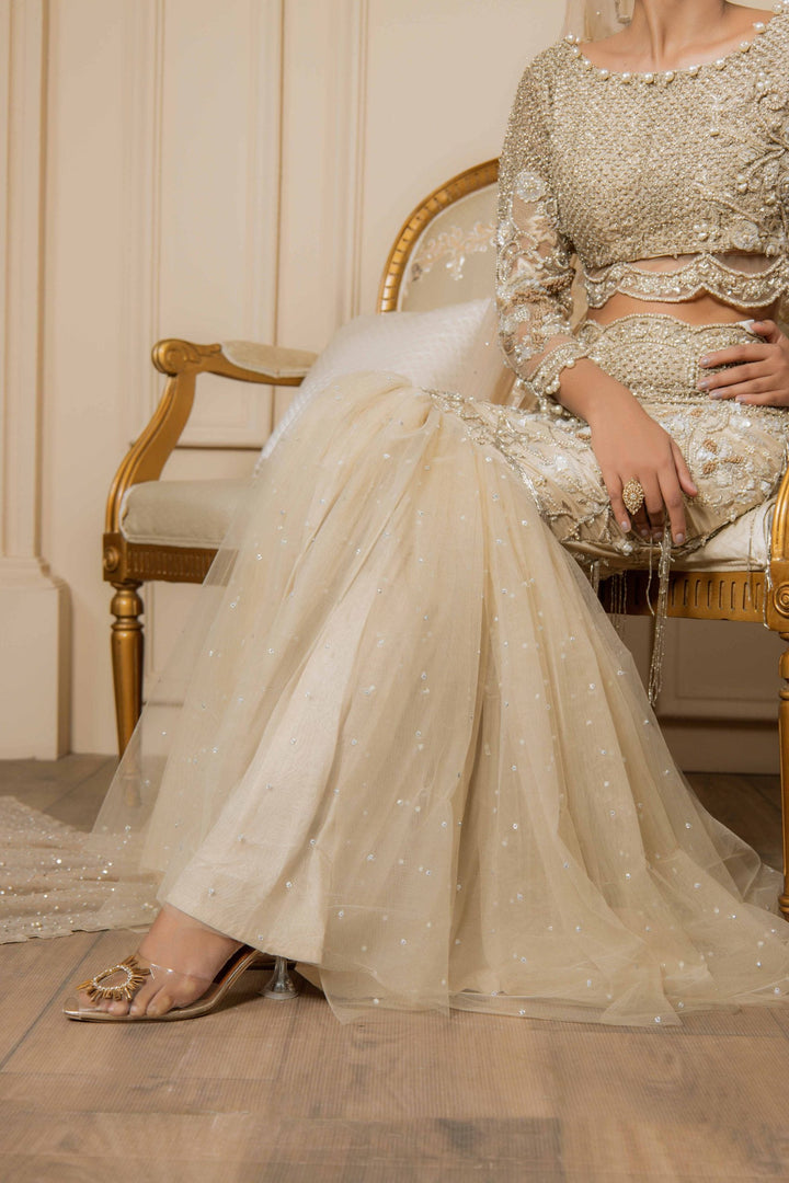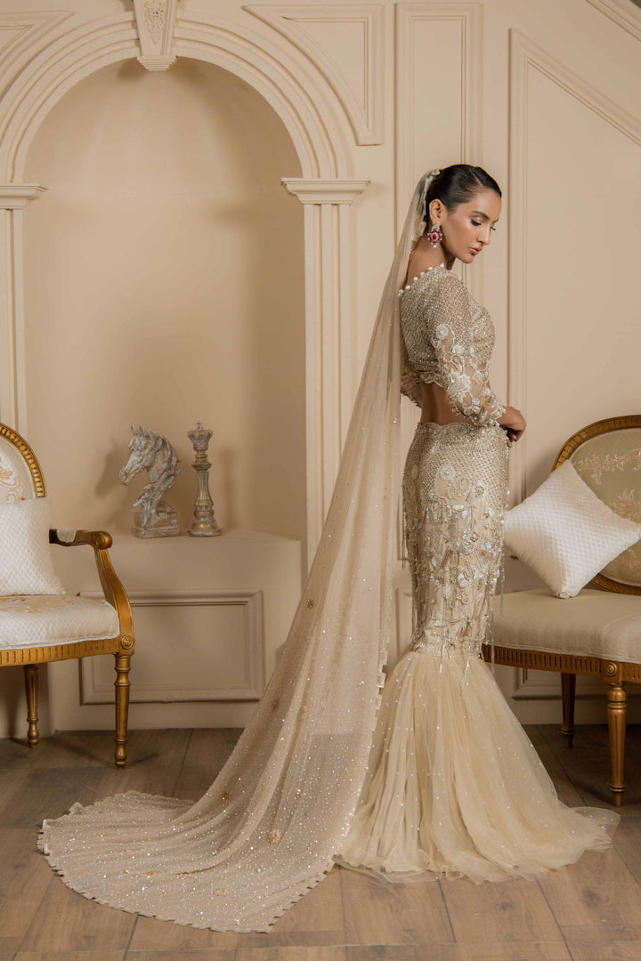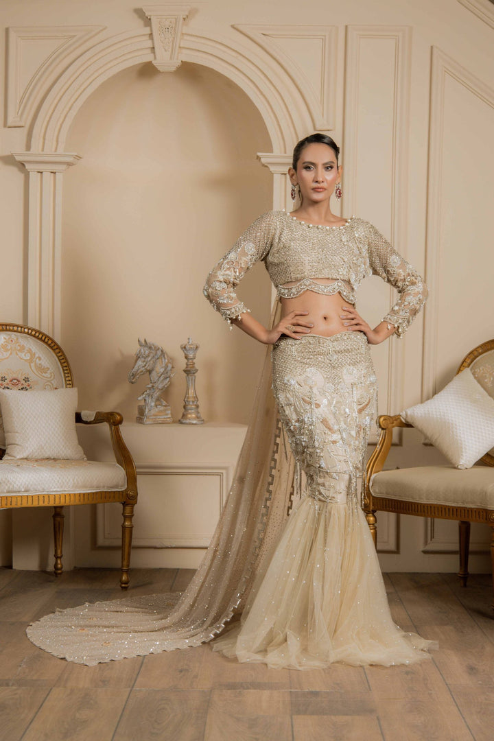 Mermaid is a dazzling and contemporary masterpiece inspired by the elegance of a mermaid silhouette. The fitted blouse and skirt are richly embellished with intricate beadwork and embroidery, flowing into a dramatic net trail that adds glamour and sophistication. The look is completed with a sheer dupatta, creating the perfect balance of modern chic and timeless luxury.