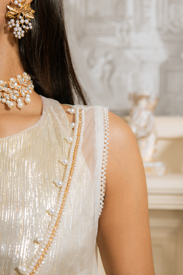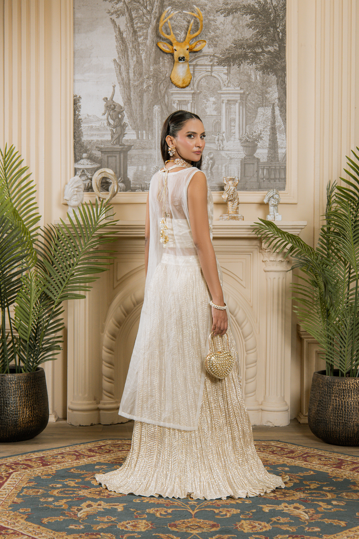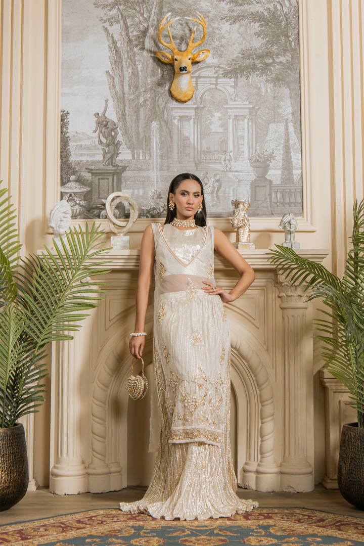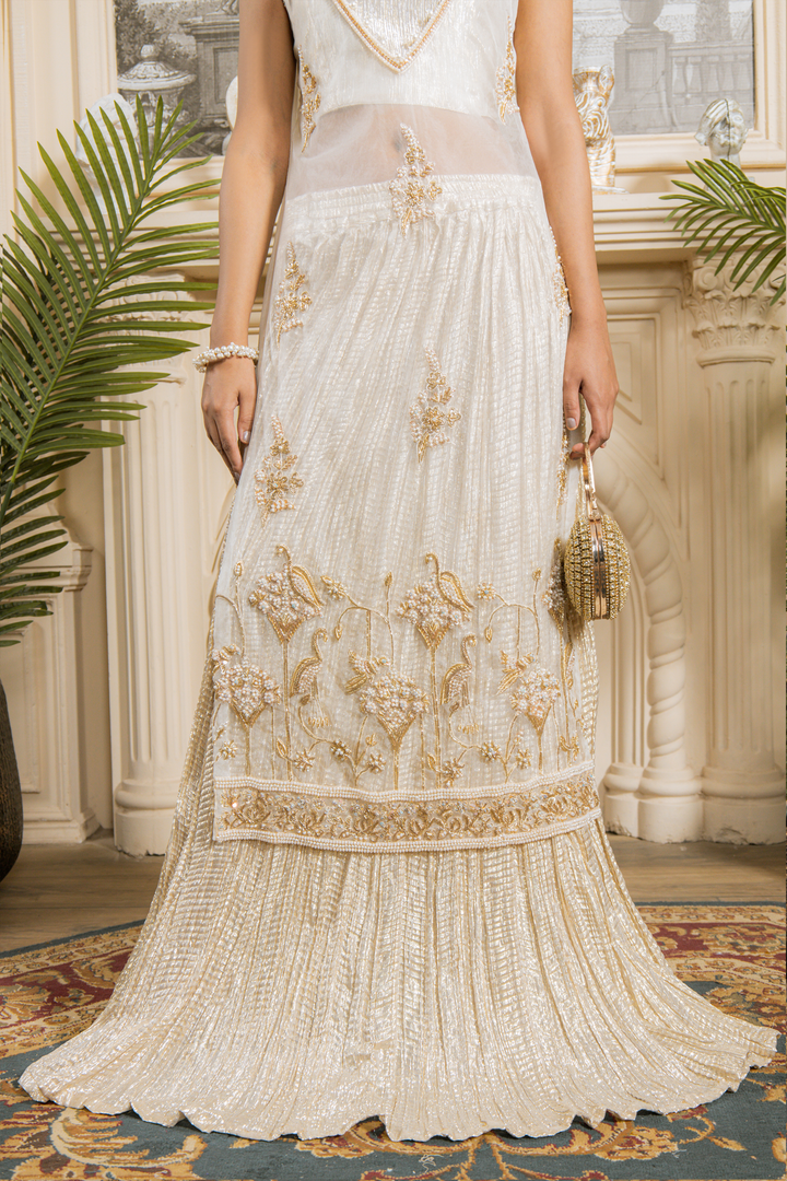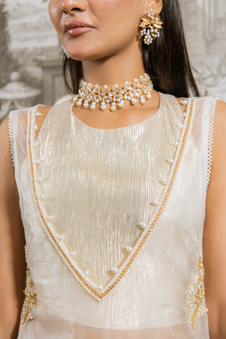 Pearl orchidis a sophisticated and graceful ensemble that radiates charm. The long organza shirt, delicately detailed with golden embroidery, overlays a shimmering inner and a flowy sharara, creating a striking layered look. Its radiant ivory and gold tones embody timeless elegance, making it an exquisite choice for receptions, festive occasions, or luxury evening wear.