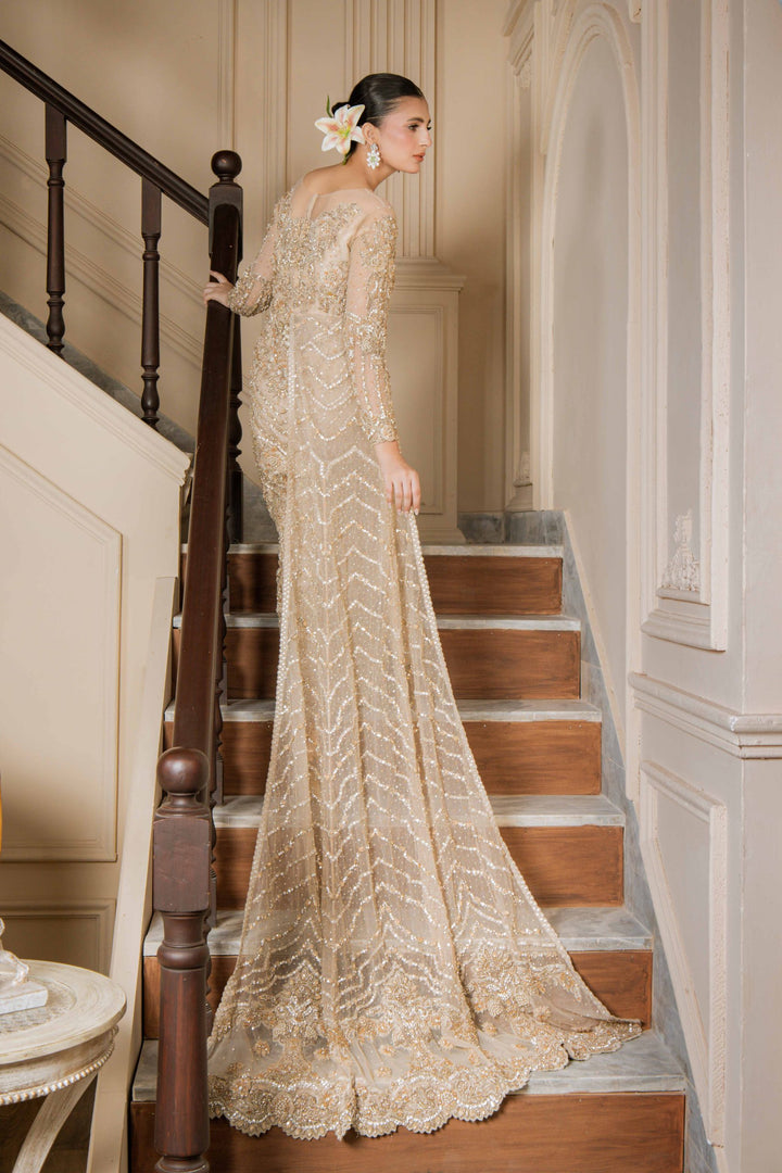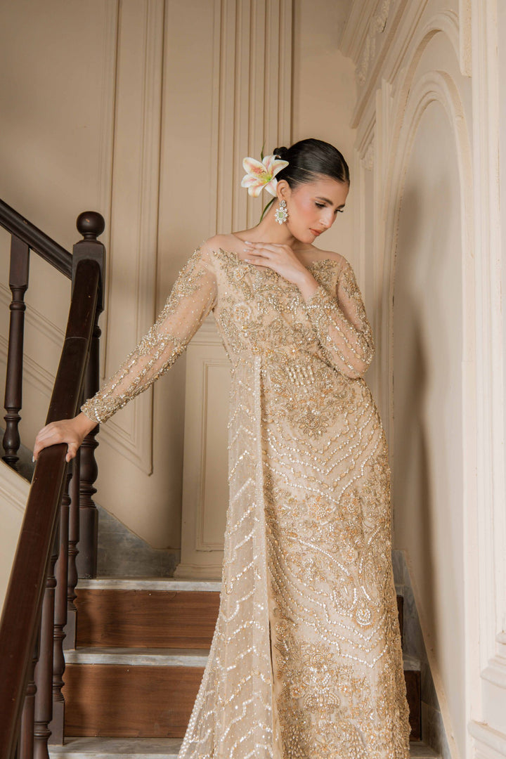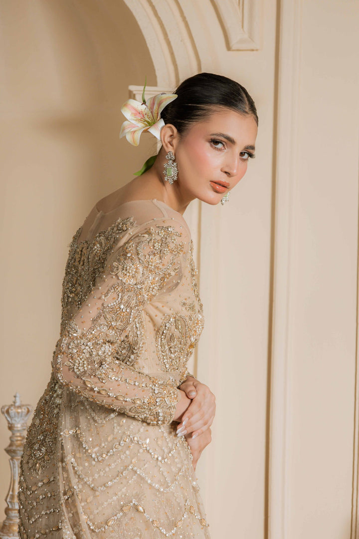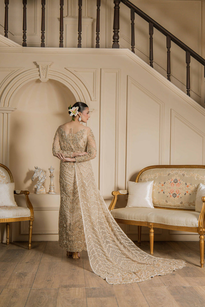 Shimmer Dust is a breathtaking masterpiece that radiates luxury and grace. Fully adorned with intricate embroidery, sequins, and beadwork, it glimmers with every movement, creating a regal presence. The long net trail at the back enhances its grandeur, making it an exquisite choice for bridal wear, receptions, or high-end formal events.