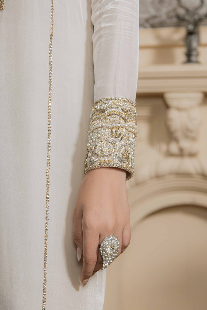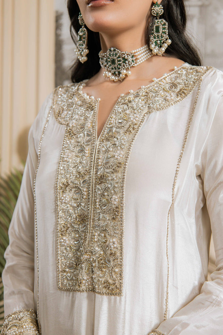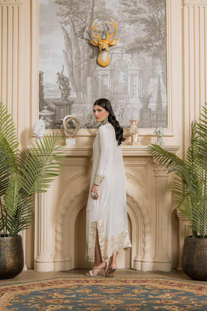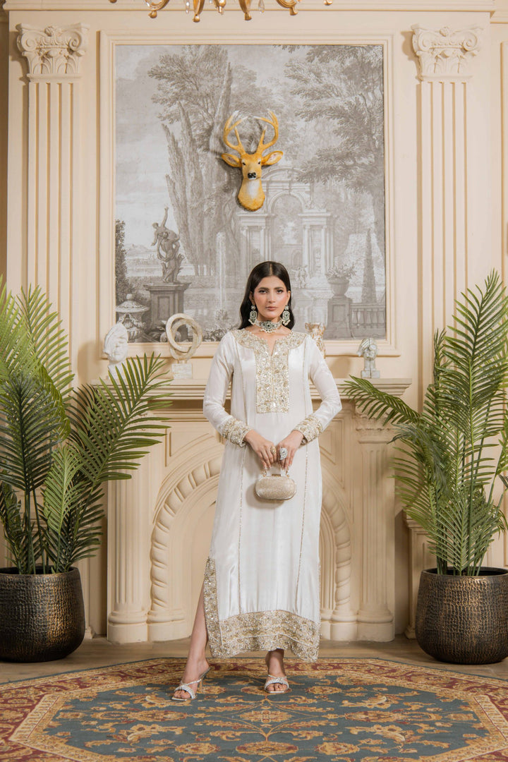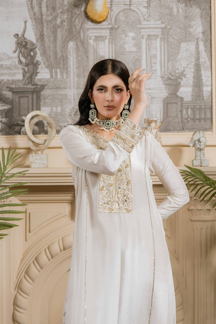 Silver mist is a graceful and refined outfit that embodies timeless sophistication. Crafted from smooth Russian silk, the shirt is adorned with intricate silver embroidery along the neckline, sleeves, and borders, giving it a touch of luxury. The soft white base paired with shimmering accents creates a serene yet regal look, perfect for formal gatherings and festive celebrations.