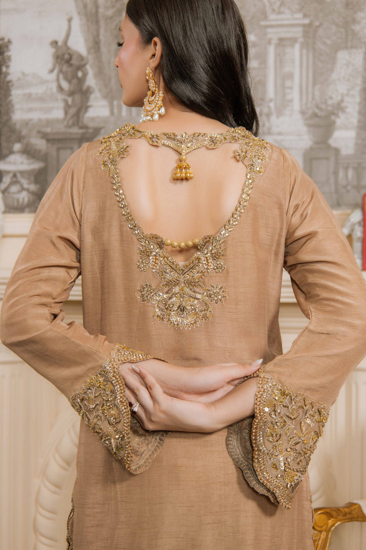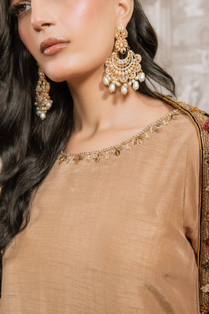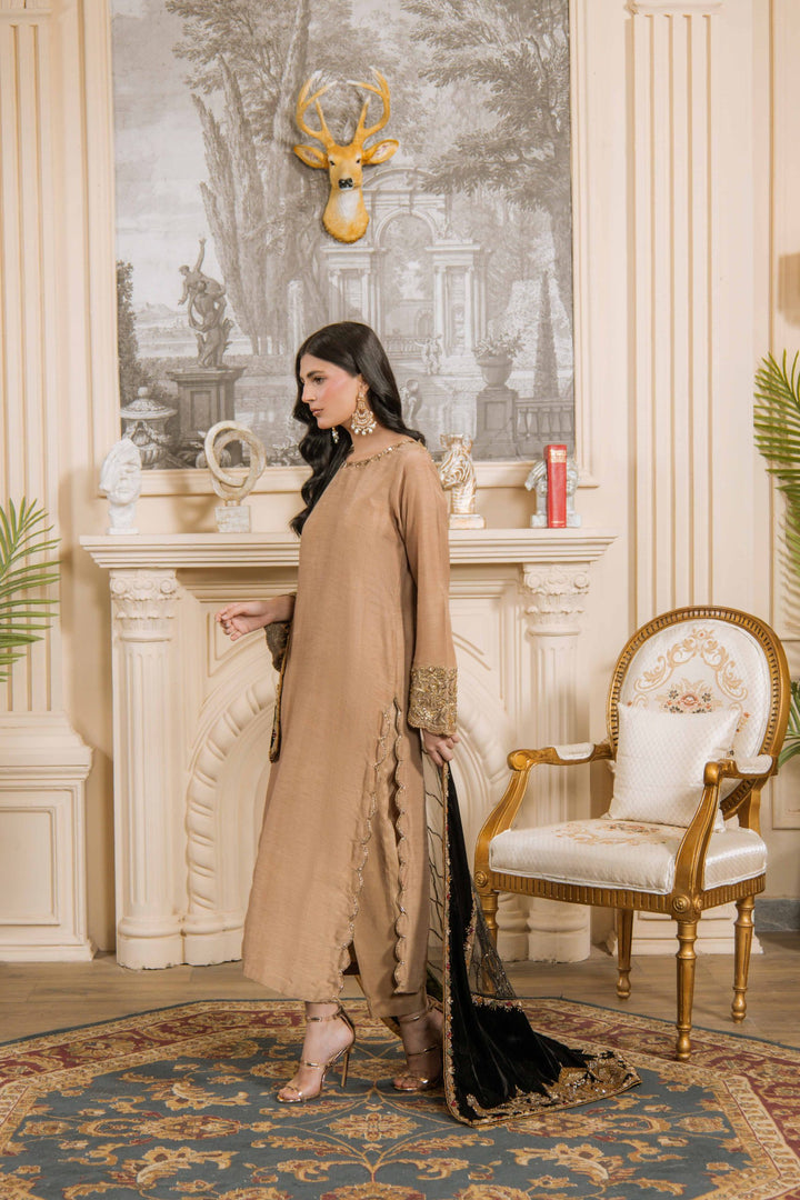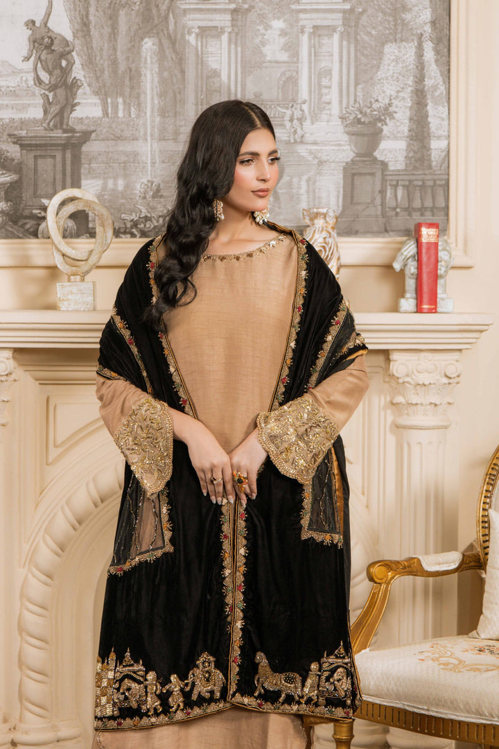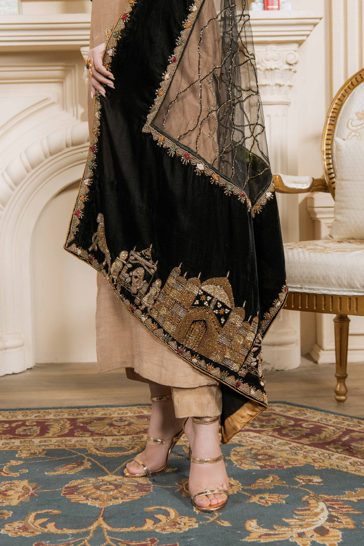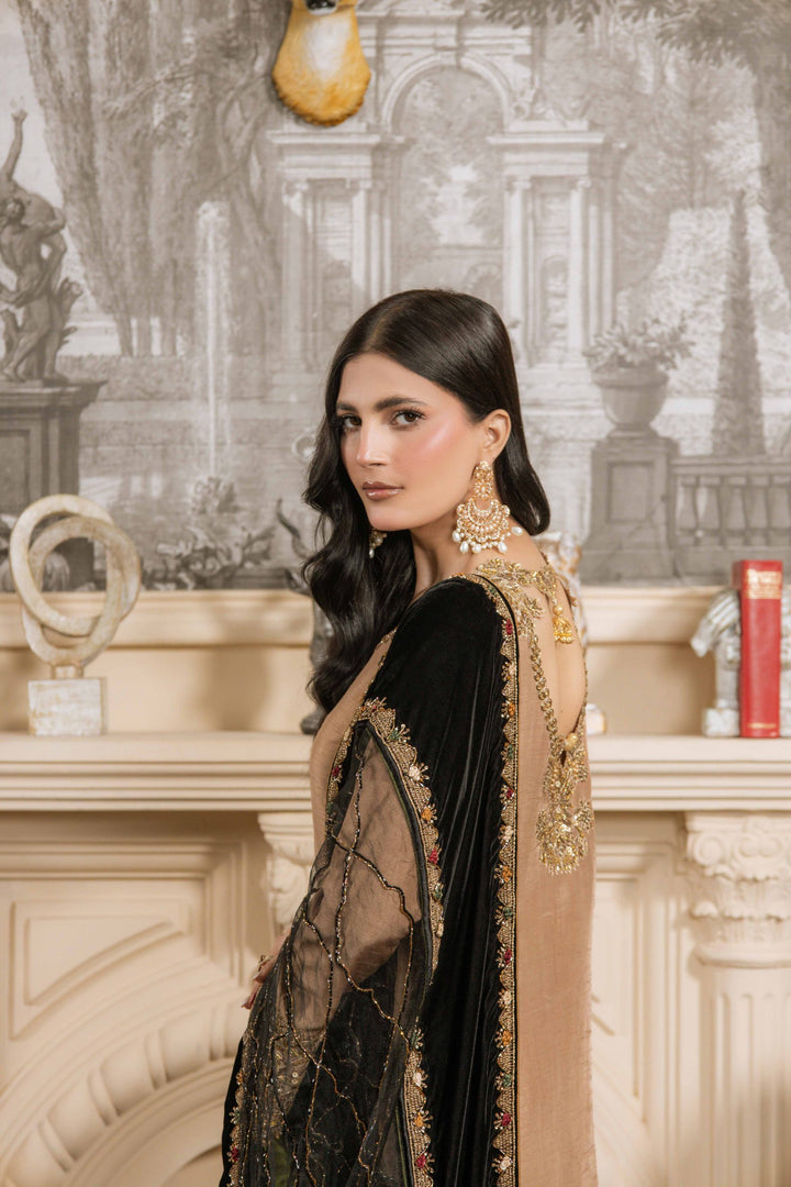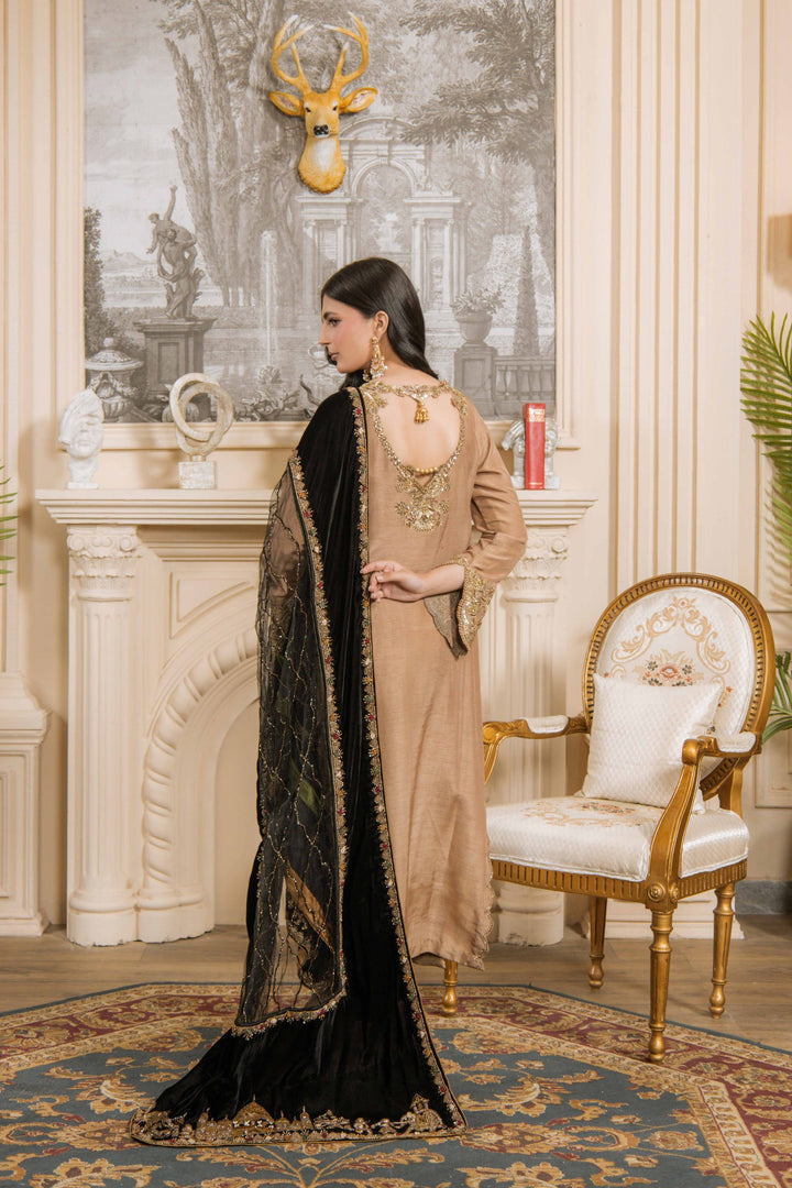Umrao Jaan is a graceful and elegant outfit that features a warm beige tone with a luxurious flow. The neckline and sleeves are delicately embellished, adding a subtle touch of glamour. Paired with a rich black velvet dupatta adorned with intricate embroidery, the look is both timeless and regal, perfect for festive and formal occasions.